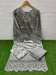 The kurti is paired with matching satin trousers (bottom) and a graceful, sheer organza dupatta that features complementary embroidery, tying the entire look together in perfect harmony.